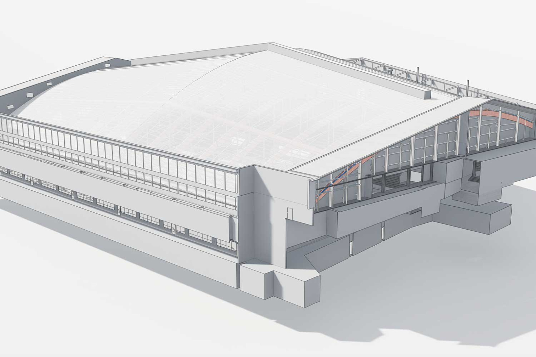 Mit 3D-Laserscanning nahm die HMQ AG die Tragkonstruktion der Arena auf. Die besondere Herausforderung lag in der detaillierten Erfassung der Dachkonstruktion: die Auflager der Hauptträger auf den Stützköpfen sowie die Montagekonstruktion des Videowürfels erforderten höchste Präzision. Auf Basis der gewonnenen Punktwolke modellierte das Team ein 3D-Architekturmodell in ArchiCAD, das Architekten, Bauingenieuren und Fachplanern als zuverlässige Grundlage für die Sanierungsplanung dient.
