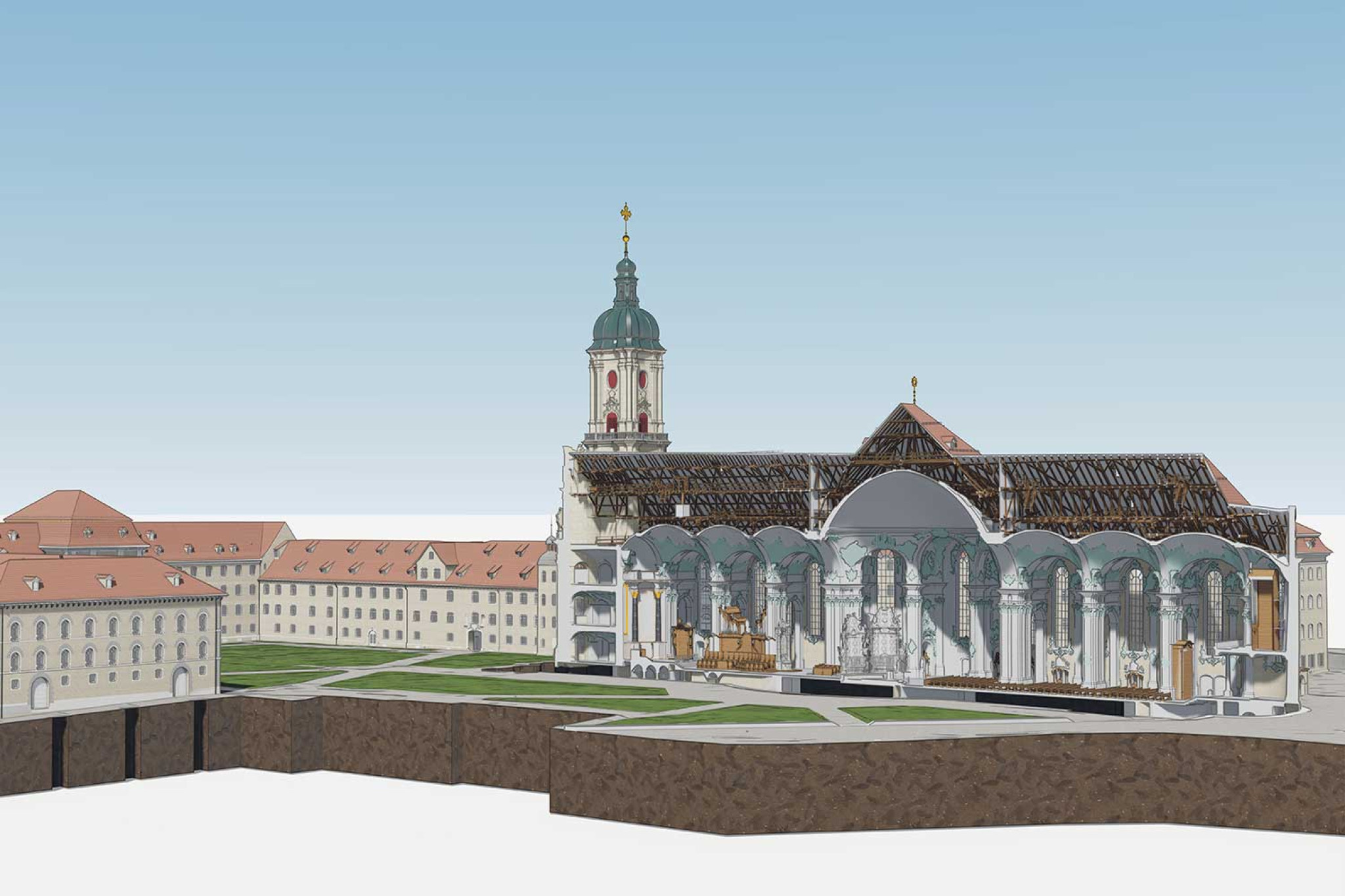 Für die vorliegende Übersicht haben wir vier Objekte ausgewählt, die zeigen, was die digitale Bestandsaufnahme am Denkmal leistet. Der Stiftsbezirk St. Gallen, das Grossmünster Zürich, der Munot in Schaffhausen und das Schloss Haldenstein in Graubünden liegen heute als BIM-Modelle in ArchiCAD vor. Eine Datengrundlage für Kantone, Architekten und Denkmalpflege.