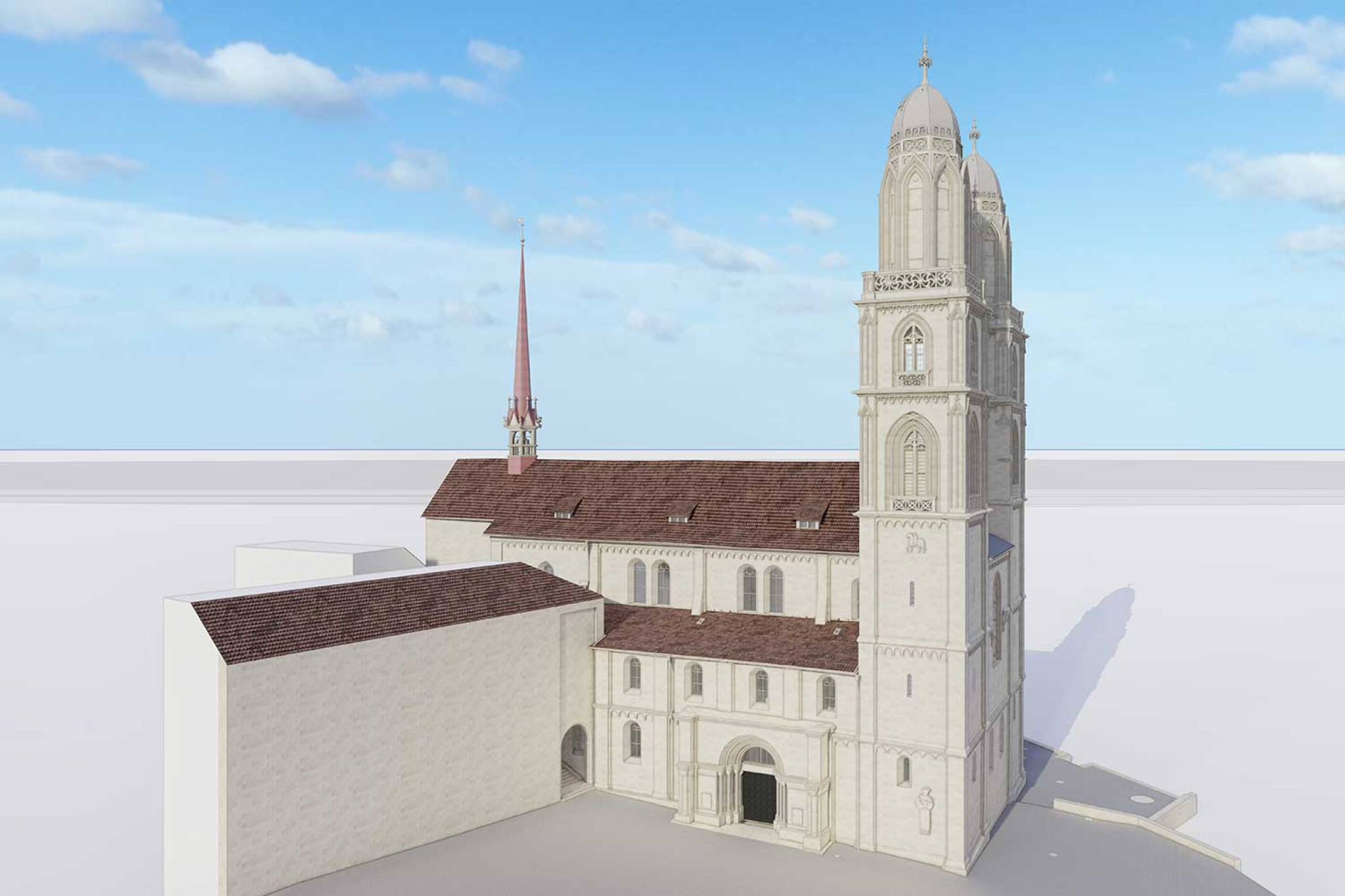 Das Grossmünster Zürich entstand in zwei Etappen. Zuerst nahm HMQ die Anlage mit 3D-Laserscanning auf, daraus entstanden 2D-Pläne und die archivierte Punktwolke. Später folgte die 3D-Modellierung auf genau dieser Datengrundlage. So steht den Planern des Hochbauamts Kanton Zürich heute ein massgenaues BIM-Modell zur Verfügung.